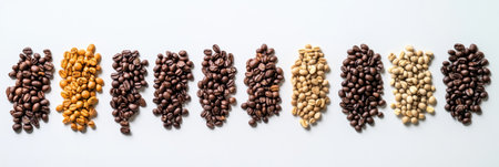Various types of coffee beans are displayed on a white background, showing their colors and textures with ample space for text.