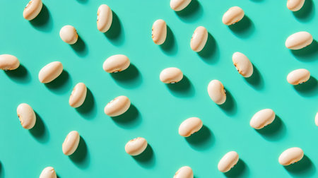 A visually striking composition of white beans scattered over a bright teal background, showcasing their natural textures and soft shadows for an artistic flair.