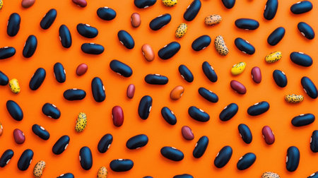 This vibrant image showcases a diverse assortment of beans scattered across a bright orange background, ideal for culinary and food-themed designs.