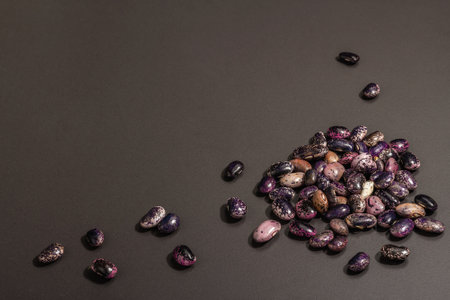 Assorted multicolored beans scattered on black stone background. Raw healthy ingredient for cooking useful food, copy space