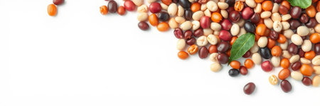 Multicolored bean scatter on white background. Healthy food banner template with text place. Kidney bean ornament on table. Nutritive dish ingredient photo for cook or recipe book