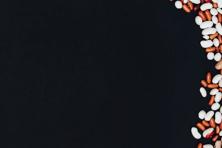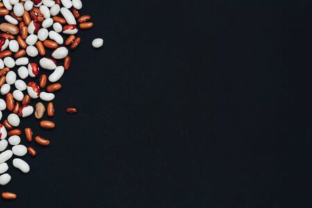 background with space for text. View from above. multi-colored beans scattered on a black background. brown and white beans