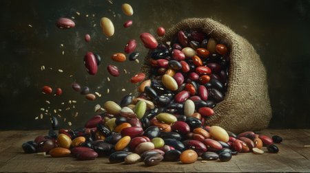 A vibrant assortment of various beans spills from a burlap sack onto a rustic wooden table, showcasing their vivid colors and textures. Ideal for culinary themes.