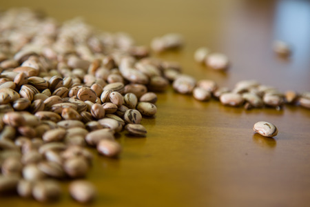 Different beans scattered on a wooden surface close-up. Naturel organic food background
