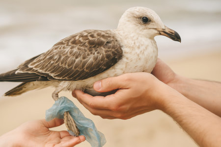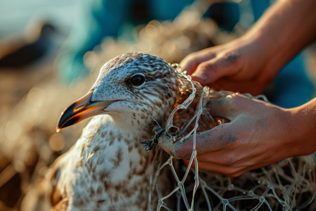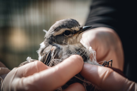person, wrapping bandage around broken wing of injured bird, created with generative ai