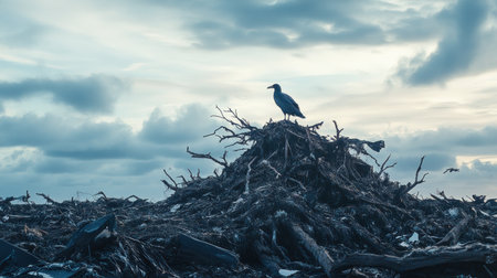 Distressed Bird in dirty pond water. Environment pollution and natural ecosystem disaster. Generate ai