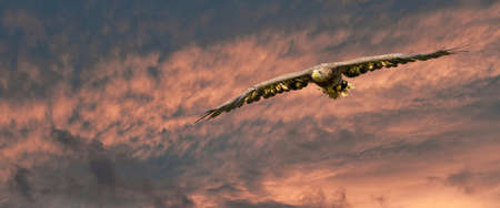 European sea eagle flying in an impressive blue and red sky. Bird of prey in flight. Flying birds of prey during a hunt. Social media, web banner or cover.