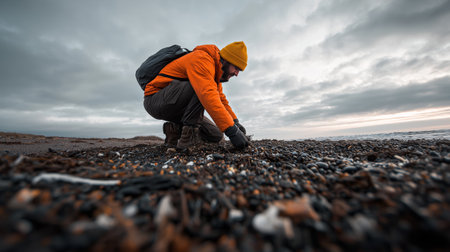 Man collects stones on rocky beach under cloudy sky near ocean in cold weather