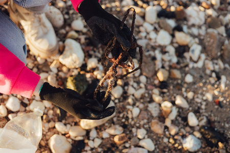 Close-up of ecologist volunteer's hands cleans the beach on the seashore from plastic and other waste. Garbage recycle and environmental care concept. Part of a series
