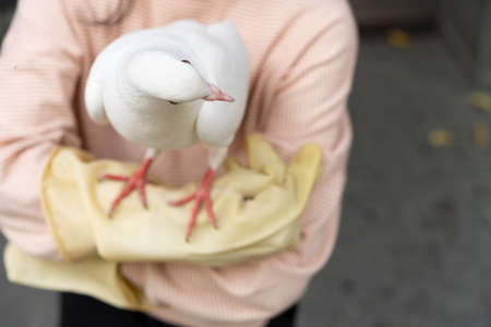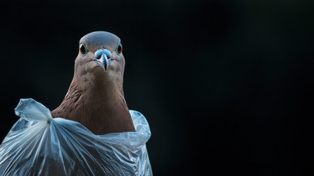 A pigeon is wearing a plastic bag on its head. Concept of humor and fun, as the bird is dressed in a human-like manner