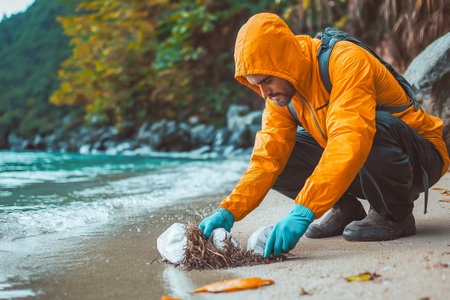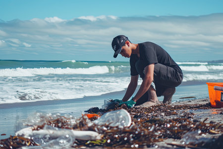 Volunteer cleans up a beautiful beach from plastic trash. Environmental conservation