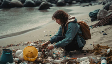 A person participating in a beach cleanup, with a focus on the amount of trash and the impact it has on the environment.