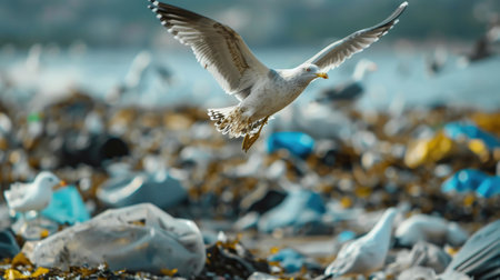 A hungry gull finds itself with a plastic bag around its neck when scavenging for food in human litter.