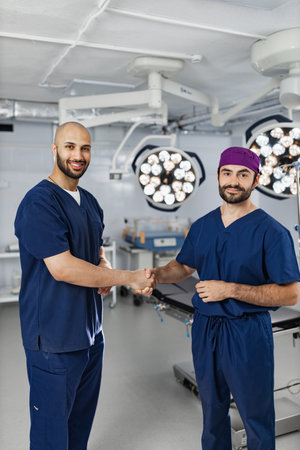 Two surgeons shake hands in a modern operating room, likely after a successful procedure or in agreement.