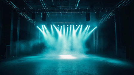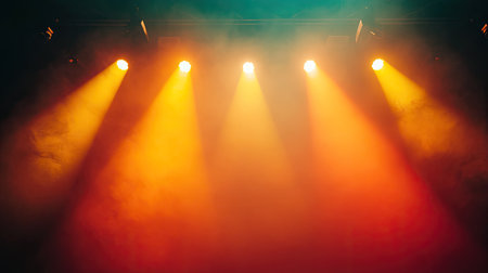 Empty concert stage with illuminated spotlights and smoke. Stage background with copy space AI generated