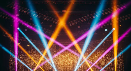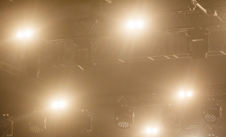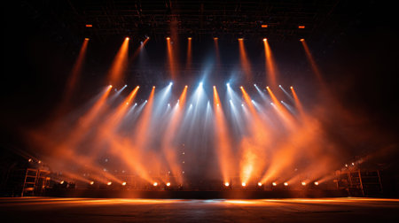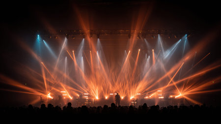 Stunning stage lights illuminate dark venue, creating dramatic atmosphere with beams of golden light cutting through haze. scene evokes excitement and anticipation