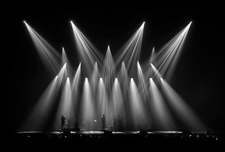 Dramatic lighting illuminates a stage with several beams converging. The black and white image displays bright light and deep shadows, suggesting a performance or show. This visual could be used for promotional materials, artistic projects, or editorial content related to entertainment.