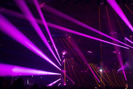 Stage lights on concert. Lighting equipment with multicolored beams.