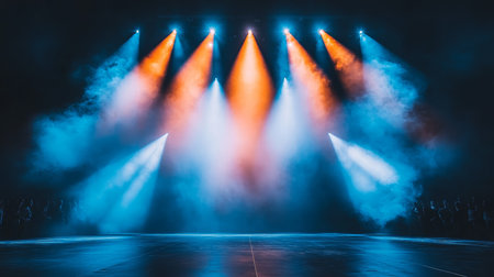 Empty Stage, Dramatic Lighting, Blue and Orange Spotlights, Glossy Floor, Entertainment