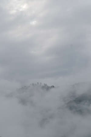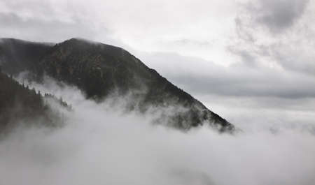Forested mountain slope in low lying cloud with the evergreen conifers shrouded in mist in a scenic landscape view