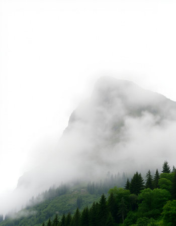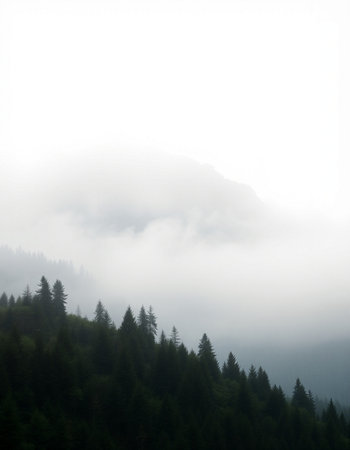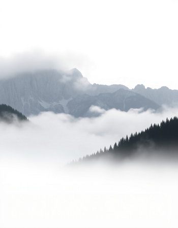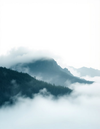Misty mountains shrouded in fog, creating a serene and mysterious atmosphere.