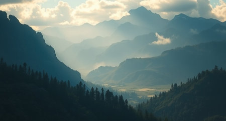 Captivating view of a serene sunrise illuminating mist-covered valleys and majestic mountains under a dramatic sky filled with soft clouds and warm hues.