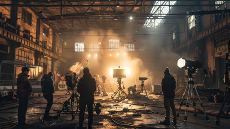 Film crew shooting movie scene in abandoned factory. Filming crew with professional camera equipment.