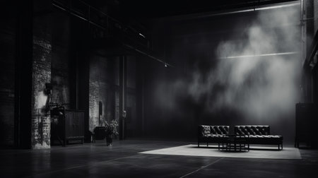a black and white photograph captures a room with a couch and chair in the middle, reminiscent of the reimagined style by industrial light and magic. the ballet academia theme is enhanced by the smokey background, creating an atmosphere of mystery. frieke janssens' artistic touch is evident in the expansive spaces and rich, immersive ambiance. the use of cryengine technology adds depth to the visual