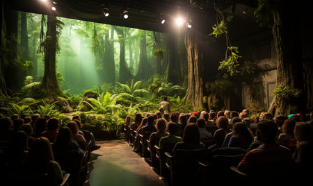 A crowded concert hall with scene stage lights, live show performance, with people silhouette, dance floor during a concert open-air festival