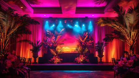 Interior of a luxury hotel room decorated with palm trees and lights