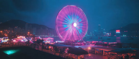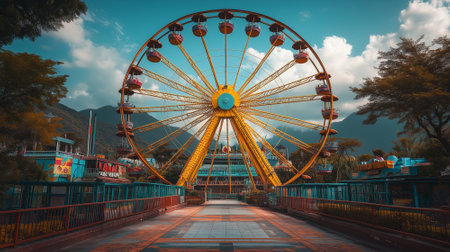 A vibrant ferris wheel with colorful cabins stands against a clear blue sky. this captivating image evokes feelings of joy and nostalgia, making it ideal for summer themes and amusement park promotions.