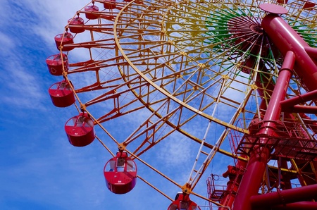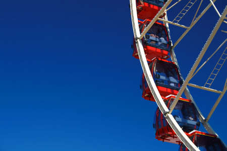 Cabins the ferris wheel against the blue sky. Summer fun at the amusement Park.