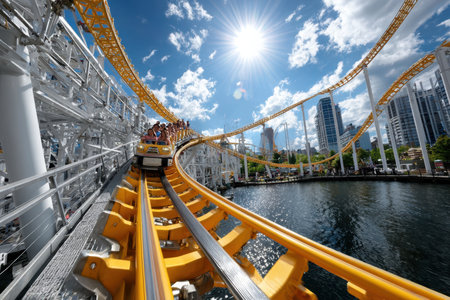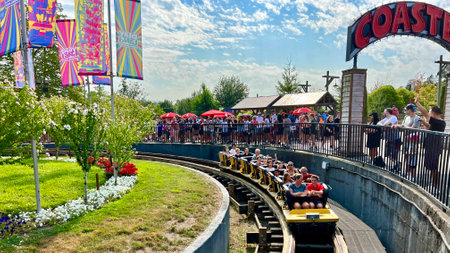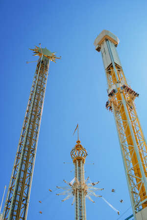 Valencia, spain - May 20, 2022: A tall, slender metal structure supports a fun roller coaster ride on a sunny summer day.