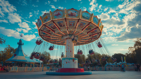 Flying swinging high chained carousel and Lifting up machine in amusement park.