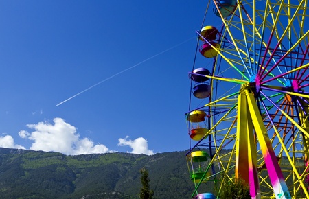 Ferris wheel on blue sky background and sun. In the amusement Park. The weekend