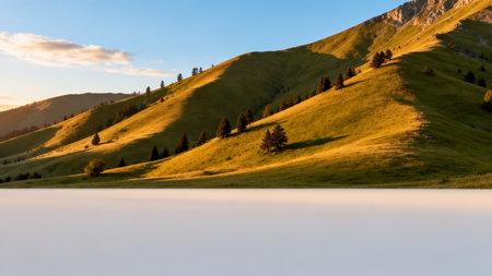 Capture the serene beauty of a hillside at sunset, where evergreen trees bask in warm light, creating a peaceful atmosphere and showcasing nature's splendor.