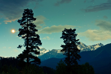 A silhouette of a beautiful mountain range and fir trees near the water under the colorful sky during sunset