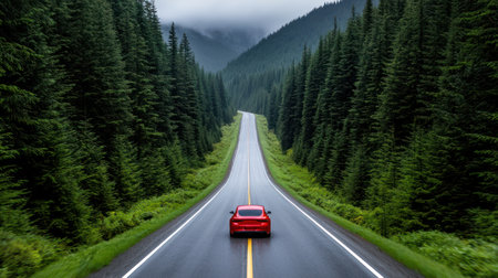 red car drives along winding road surrounded by lush green trees, evoking sense of adventure.