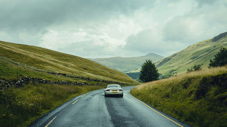 scenic road trip through the mountains, with towering peaks and winding roads, created with generative ai