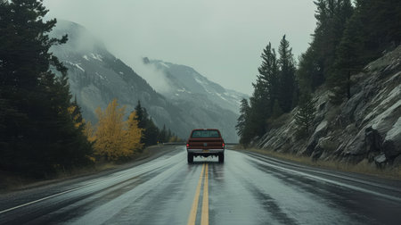 A large pickup on the road in the mountains. Cinematic. AI generative.