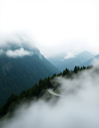 Winding asphalt road navigating through pine trees and fog, ascending towards a mountain peak. Winding mountain road leading to a foggy Alps peak