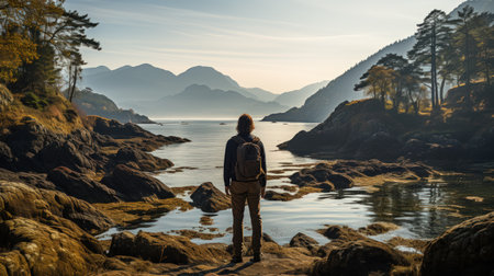 Man standing on the edge of a mountain lake and looking at the mountains