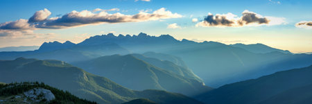 Explore a breathtaking view of misty valleys and rolling hills in a serene mountain landscape under a clear sky, capturing the essence of the wilderness.