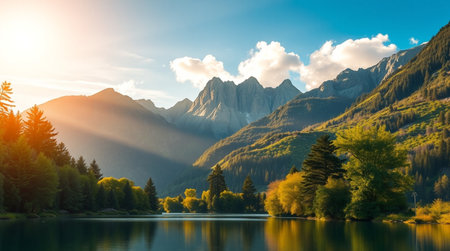 In the morning light a serene landscape unfolds, where the tranquil lake reflects the majestic mountains and their enchanting surroundings, creating a scene that feels both timeless and magical