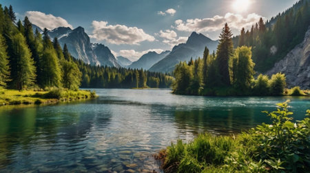 A body of water surrounded by trees and mountains. AI generative image.