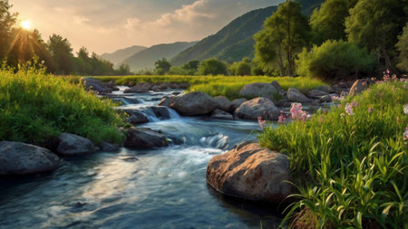 Refreshing river flows through lush greenery in the early hours of morning light
