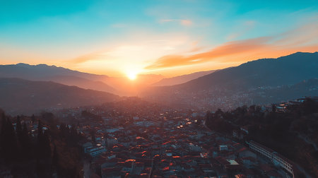 A breathtaking aerial view of a colorful village nestled among lush mountains and vibrant autumn foliage, showcasing the beauty of nature and architecture.