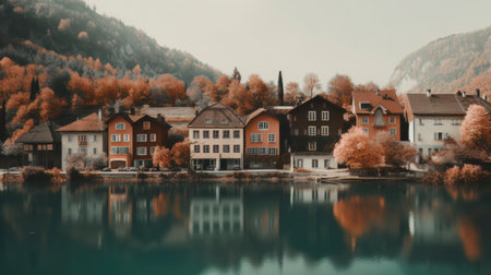 Colorful lakeside homes, reflections dancing in the water. Picturesque view, Ai Generated.