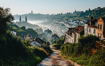 A picturesque autumn street in a historic town, lined with colorful trees and charming architecture. The scene captures the tranquil beauty of fall.