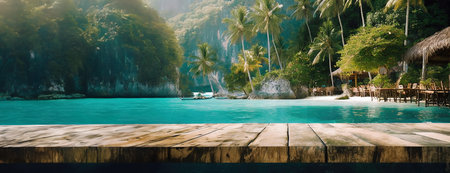 Tropical beach scene with palm trees, turquoise water, cliffs, and a rustic wooden dock in a secluded, sunny island paradise. Panorama with copy space..
